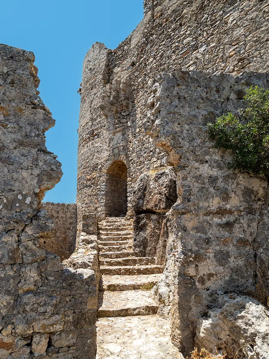 Originally, Asklipio Castle featured four towers and a surrounding wall about 110 meters long. Inside, it covered around 750 square meters, and the outer walls were 1.5 meters thick. Today, you can still admire two of its towers, the striking entrance gate, and ruins of various interior structures—all in relatively good condition.