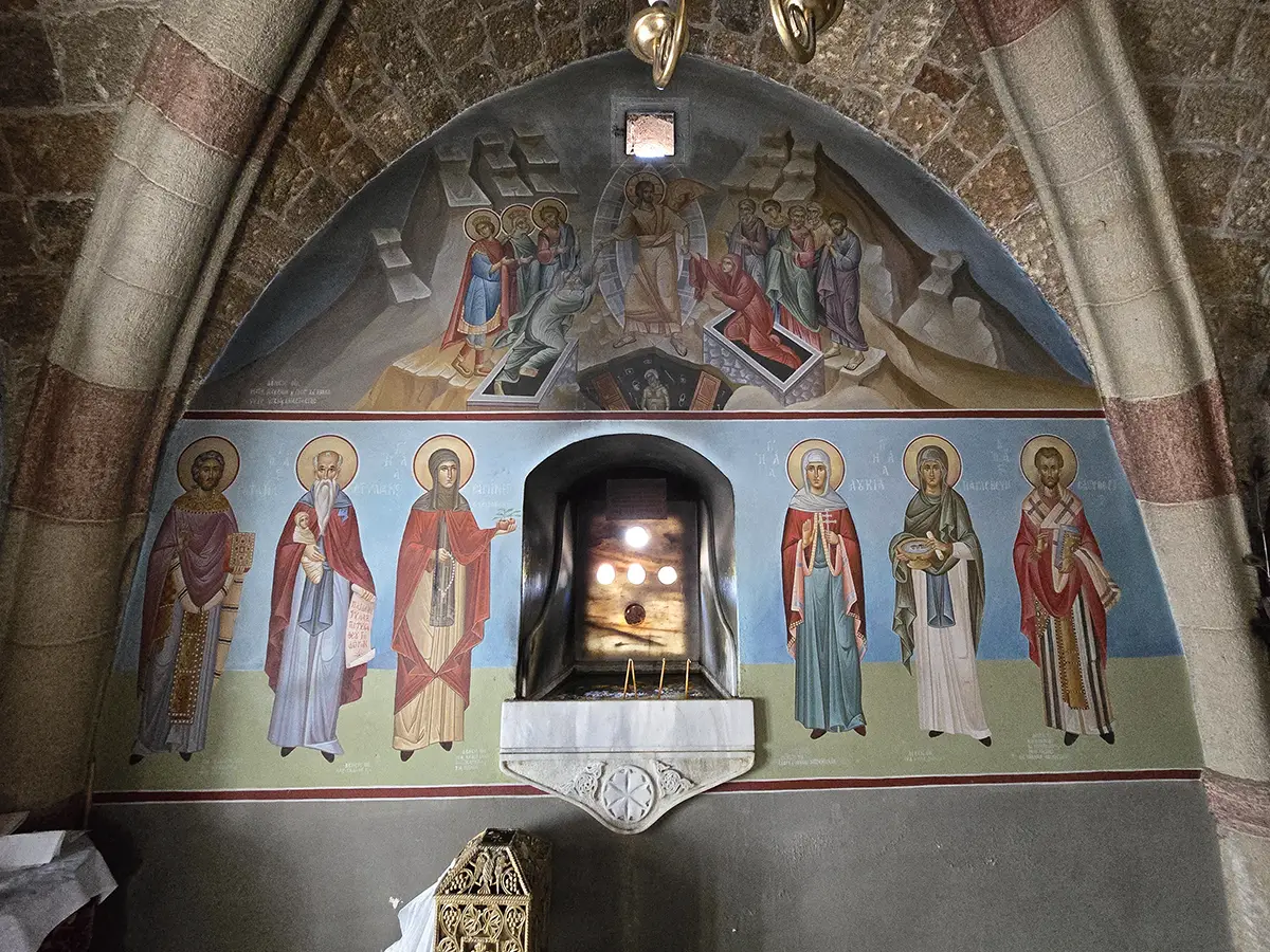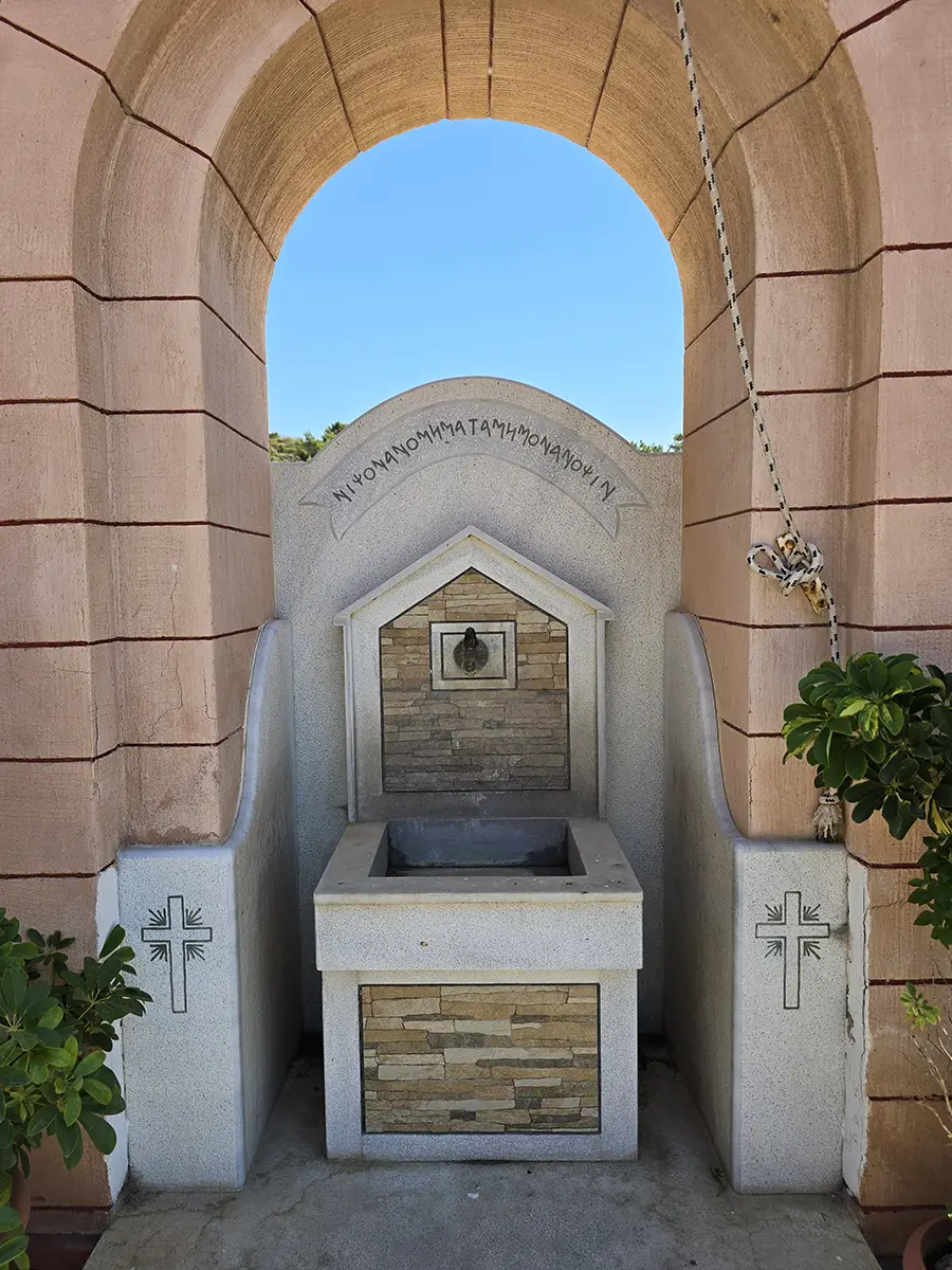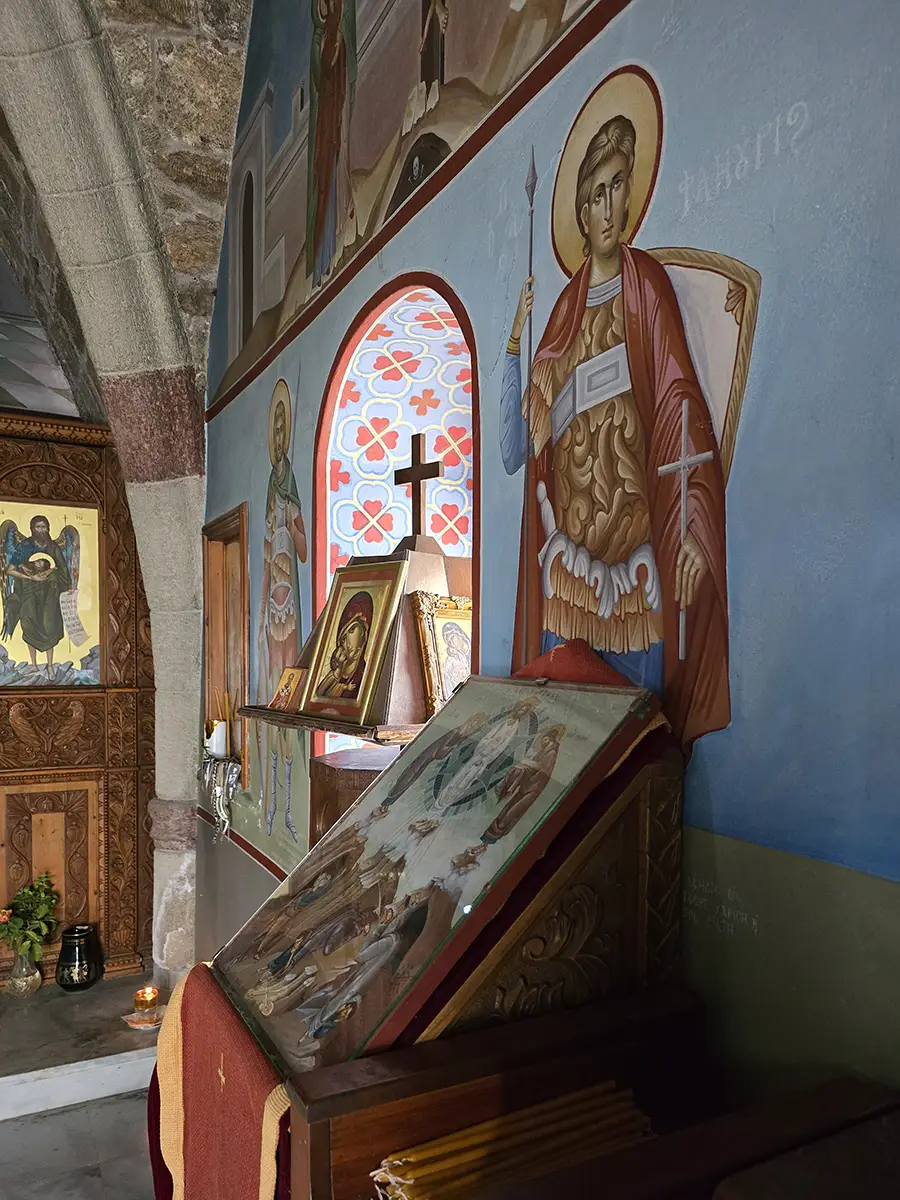 Its single nave architecture, constructed from sandstone and topped with a tiled roof, gives it a unique silhouette against the landscape. Inside, vistors can admire stunning frescoes and a small wooden iconostasis. In the courtyard, there is the bell tower with a fountain at its base, and a lovely wooden pergola.