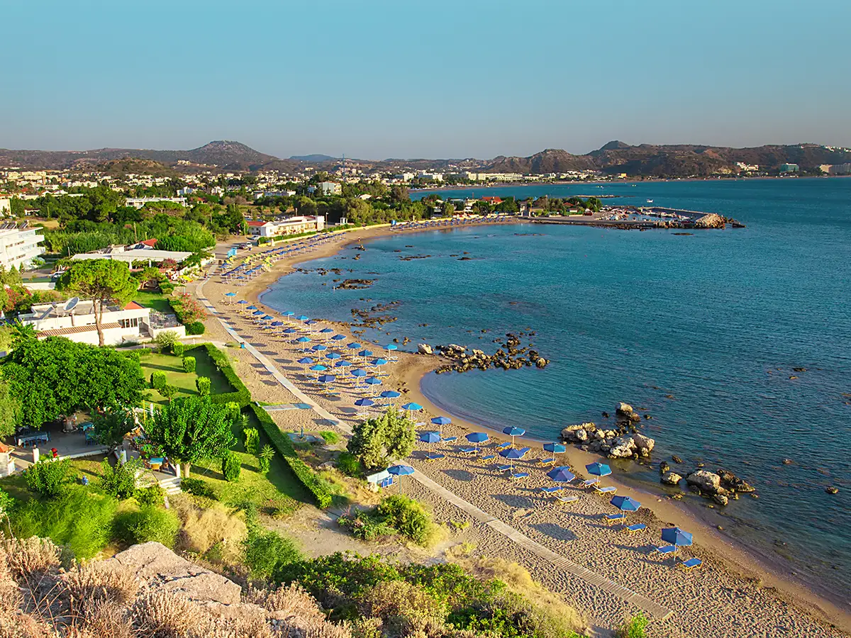 Nestled in the bustling Faliraki — a hotspot for tourists on the island — this 5-kilometer beach offers a golden ribbon of sand and shimmering, crystal-clear waters that invite you to dive right in. The beach’s shallow, warm waters make it ideal for families with young children, offering a safe and soothing place to swim and play.