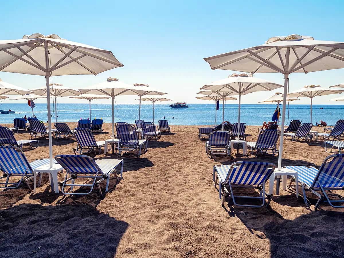 Faliraki Beach is fully equipped for comfort and fun. You’ll find sunbeds, umbrellas, showers, and a wide range of beach bars and seaside restaurants, perfect for grabbing a refreshing drink or a delicious meal with a view.