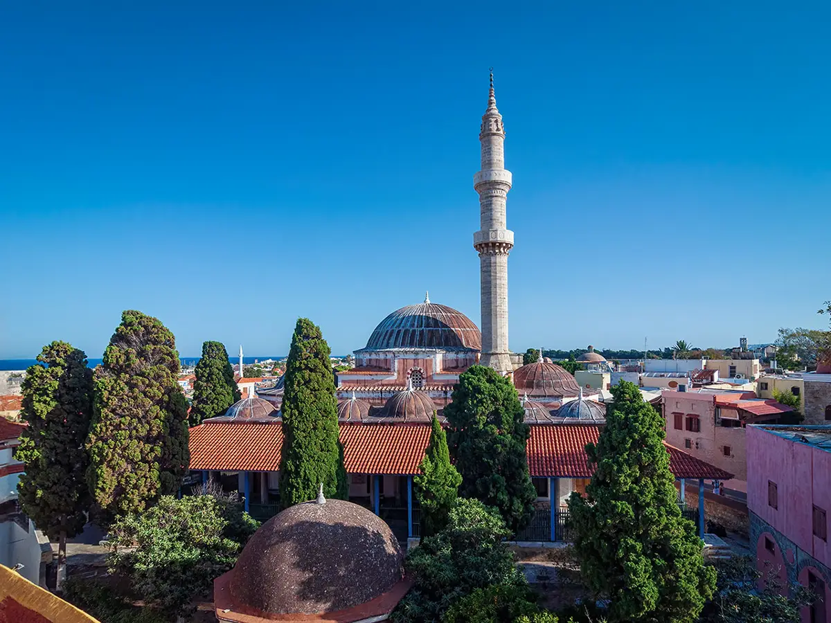 Built on the foundations of an old church, it was the first mosque built in the city of Rhodes after its siege. It dominates the highest point of Socratous Street in the Medieval Town of Rhodes and is believed to have been almost entirely reconstructed in 1808. In fact, materials from knightly buildings and churches were used.